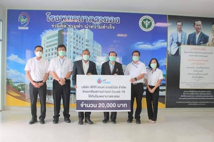 ในวันเดียวกันกรรมการผู้จัดการใหญ่ บริษัท พีทีที แทงค์ฯ พร้อมด้วยผู้บริหาร ได้มอบเงินบริจาคเพื่อสมทบทุนจัดซื้อเครื่องมือแพทย์ในสถานการณ์แพร่ระบาดของโรค COVID-19 ให้กับโรงพยาบาลระยอง จำนวน 20,000 บาท โดยมีนายแพทย์วิชาญ โชคเรืองสกุล รองผู้อำนวยฝ่ายการแพทย์ โรงพยาบาลระยองเป็นผู้รับมอบ
