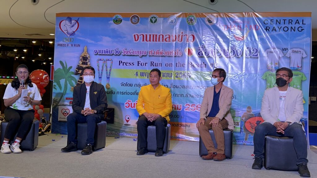 วันที่4พฤศจิกายน 2565 นาย ไตรภพ วงศ์ไตรรัตน์ ผู้ว่าราชการจังหวัดระยอง พร้อมด้วย อาจารย์บัญชาฮาดสม รองประธานผู้ประกอบการหาดแม่รำพึงจังหวัดระยอง นายวัชรพลสานสอน การท่องเที่ยวแห่งประเทศไทย ททท สำนักงานระยอง นายกิตติพงษ์ สีปิยาารักษ์ ผู้จัดการทั่วไปศูนย์การค้าเซ็นทรัลระยอง ร่วม เป็นประธานในการเปิดกิจกรรมการแถลงข่าว กิจกรรม เดิน-วิ่ง “Press For run on the Beach (สื่อชวนวิ่ง ) วิ่งร่วมบุญ ทำดีด้วยหัวใจ ครั้งที่ 2 จัดโดยโดยกลุ่มพันธมิตรข่าว สื่อมวลชน ร่วมกับ การท่องเที่ยวแห่งประเทศไทย(ททท.สำนักงานจังหวัดระยอง) ณ.ที่ชายทะเลบ้านเพ-สวนสน ในวันที่ 8 ธันวาคม 2565 เวลา04.00น.-09.00 น.
