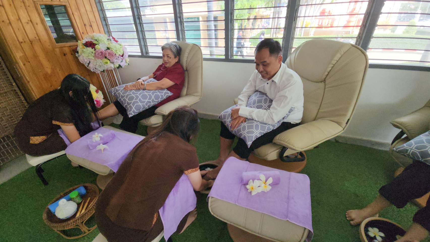 เมื่อวันที่ 31 ต.ค.ผู้สื่อข่าวรายงานว่า วิทยาลัยเทคนิคระยอง ได้ถือฤกษ์วันฮาโลวีน 2023 เปิดร้านสปาให้บริการนวดผ่อนคลาย นวดฝ่าเท้า นวดประคบ อบซาวน่า ทำเล็บ และสระไดร์ ภายในวิทยาลัย ชื่อร้าน ‘Salon Tour’ บริเวณชั้น 1 อาคารสาขาวิชาการท่องเที่ยว โดย นศ.สาขาวิชาการท่องเที่ยว ปวช.3 เป็นพนักงานนวด ซึ่งเป็นการประชาสัมพันธ์เชิญชวนให้ผู้สนใจมาใช้บริการนวด ช่วยให้ นศ.มีรายได้ระหว่างเรียน โดยวันแรกของการเปิดให้บริการ ได้มีการจับ นศ.แต่งเป็นผี เพื่อเป็นการโปรโมทร้านให้เป็นที่รู้จักอย่างแพร่หลายด้วย โดยเปิดให้บริการวันจันทร์-ศุกร์ เวลา 09.00-15.30 น.