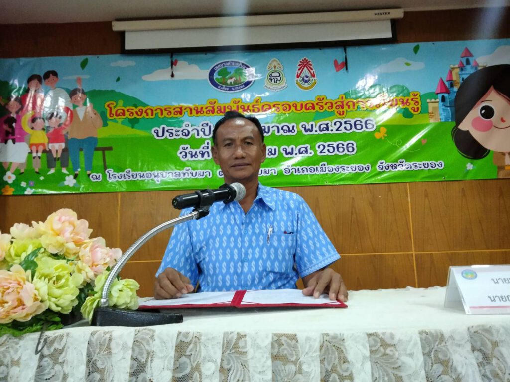 เมื่อวันที่ 1 มี.ค.ที่โรงเรียนอนุบาลทับมา ต.ทับมา อ.เมือง จ.ระยอง นายประเสริฐ วงษ์ศรี นายกเทศมนตรีตำบลทับมา เป็นประธานเปิดโครงการสานสัมพันธ์ครอบครัวสู่การเรียนรู้ ประจำปีงบประมาณ 2566 มีผู้ปกครองนักเรียนศูนย์พัฒนาเด็กเล็กบ้านทับมา โรงเรียนนุบาลทับมา เข้าร่วมโครงการ 70 คน มีวิทยากรนักจิตวิทยาจาก รพ.กรุงเทพระยอง มาให้ความรู้