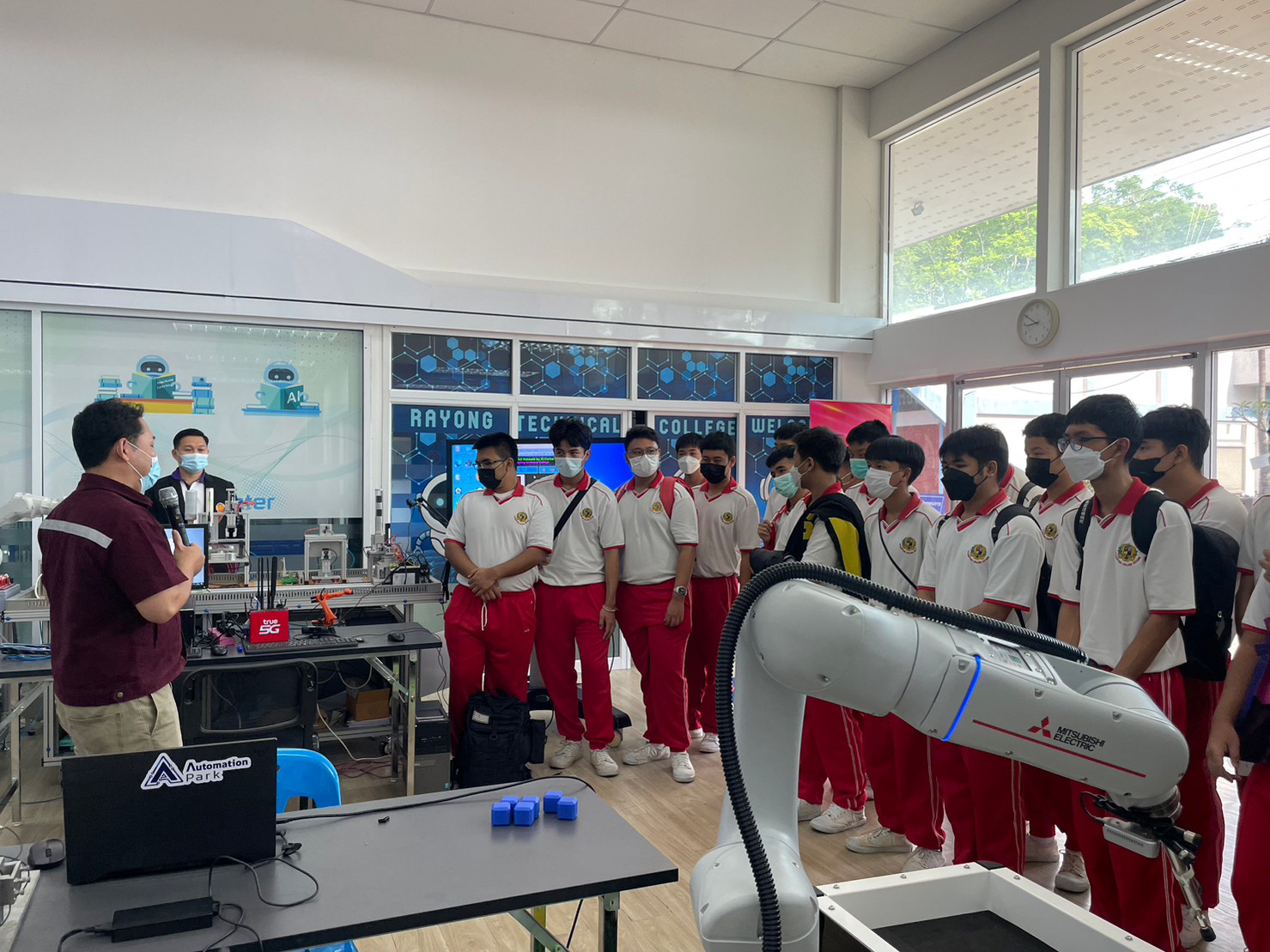 วิทยาลัยเทคนิคระยอง โชว์ทักษะวิชาชีพด้านเทคโนโลยีปัญญาประดิษฐ์แก่ครู นักเรียนสถานศึกษาในพื้นที่ที่สนใจเรียนด้านเทคโนโลยีปัญญาประดิษฐ์เพื่ออุตสาหกรรมใน EEC