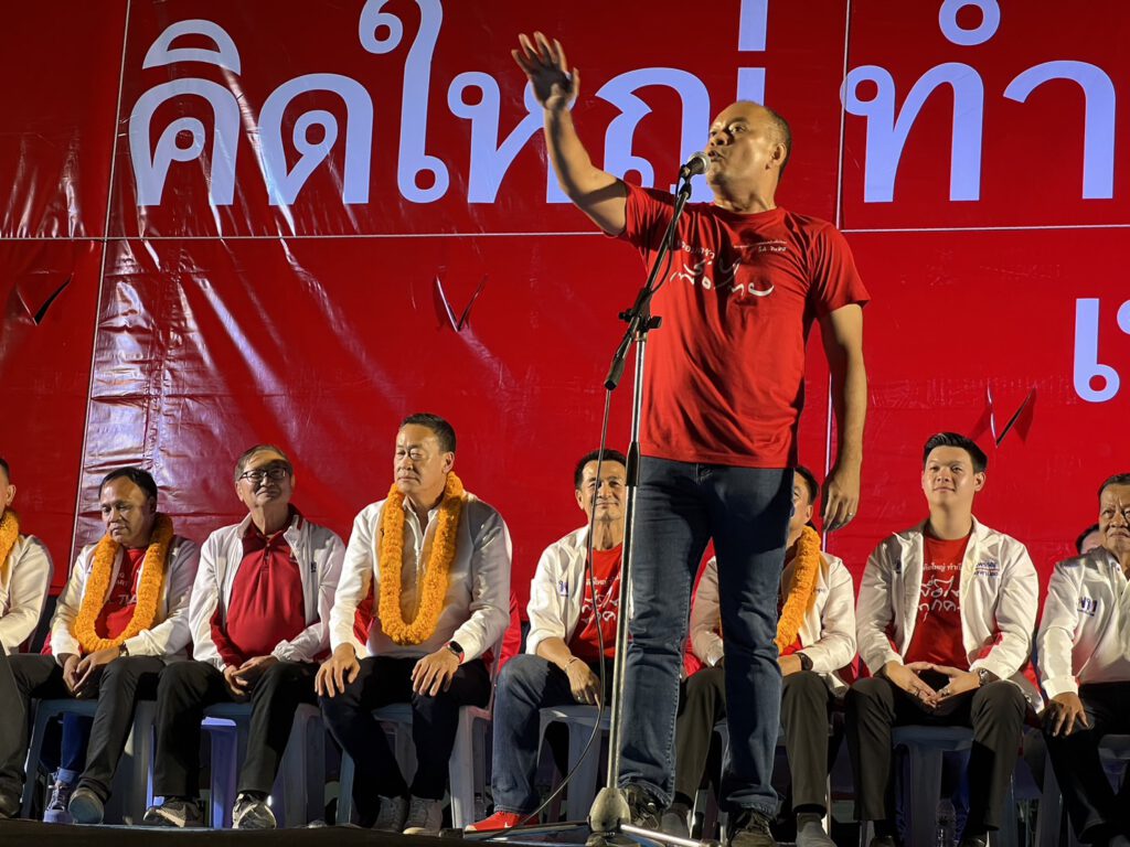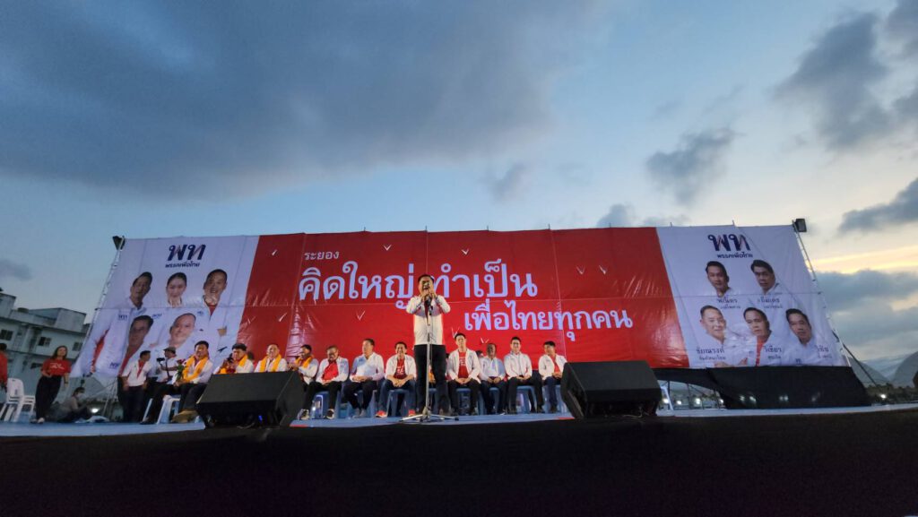เมื่อเวลา 18.00 น. วันที่ 19 มี.ค.66 ที่บริเวณลานโครงการหมู่บ้านเพลินใจ 5 ข้างสถานีขนส่งผู้โดยสารแห่งใหม่ระยอง ต.ทับมา อ.เมือง จ.ระยอง ผู้สื่อข่าวรายงานว่า พรรคเพื่อไทยได้จัดเวทีปราศรัยใหญ่ช่วยว่าที่ผู้สมัคร ส.ส.ระยอง พรรคเพื่อไทยทั้ง 5 เขต ประกอบด้วย เขต 1 นายพเนตร วงศ์ไพศาล เขต 2 นายภีมเดช อมรสุคนธ์ เขต 3 นายชัยณรงค์ สันทัสนะโชติ เขต 4 นายวิเชียร สุขเกิดและเขต 5 นายวิชัย ล้ำสุทธิ นำโดย นพ.ชลน่าน ศรีแก้ว หัวหน้าพรรค นายเศรษฐา ทวีสิน ประธานที่ปรึกษาหัวหน้าครอบครัวเพื่อไทย นายอดิศร เพียงเกษ โฆษกผู้นำฝ่ายค้านในสภาผู้แทนราษฎร นายณัฐวุฒิ ใสยเกื้อ ผู้อำนวยการครอบครัวเพื่อไทย และนพ.พรหมินทร์ เลิศสุริย์เดช ประธานคณะกรรมการด้านเศรษฐกิจพรรค โดยมีประชาชนชาวจังหวัดระยอง นับหมื่นคนเดินทางมารับฟังการปราศัย