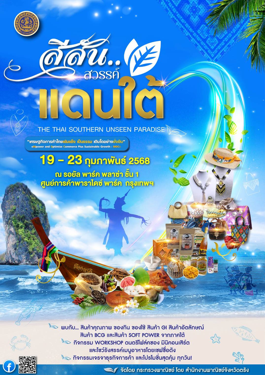 สำนักงานพาณิชย์จังหวัดตรัง นำทีมพาณิชย์กลุ่มจังหวัดภาคใต้ 11 จังหวัด ยกขบวนสินค้าเด่น สินค้า อัตลักษณ์ สินค้า GI และของดีภาคใต้ กว่า 50 ร้านค้า มาโชว์ศักยภาพในงานสีสัน สวรรค์แดนใต้ (THE THAI SOUTHERN UNSEEN PARADISE) ระหว่างวันที่ 19-23 ก.พ.68 ณ ศูนย์การค้าพาราไดซ์พาร์ค ศรีนครินทร์
