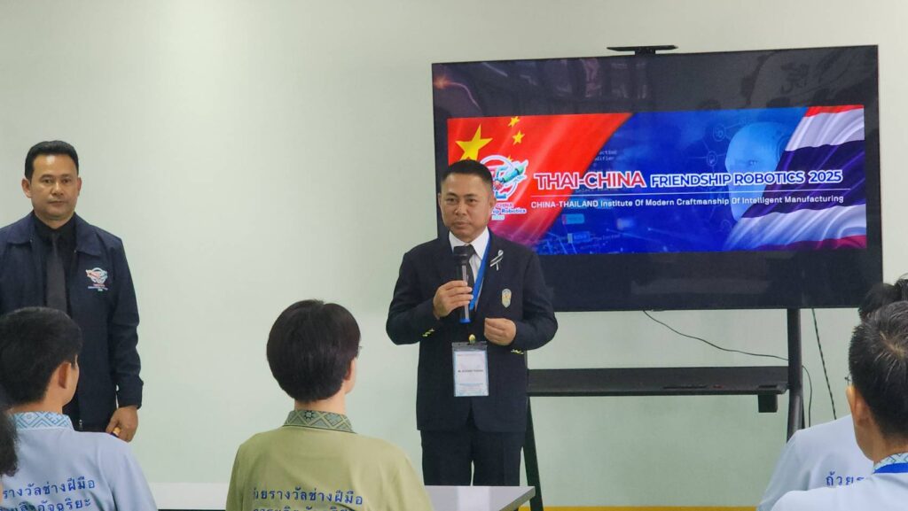 เมื่อเวลา 08.30 น. วันที่ 6 พ.ย.68 ที่สถาบันช่างฝีมือสมัยใหม่อัจฉริยะไทย–จีน วิทยาลัยเทคนิคบ้านค่าย ต.หนองละลอก อ.บ้านค่าย จ.ระยอง ผู้สื่อข่าวรายงานว่า นายราตรีสวัสดิ์ ธนานันต์ ที่ปรึกษาด้านมาตรฐานอาชีวศึกษาช่างอุตสาหกรรม เป็นประธานเปิดการอบรมเชิงปฏิบัติการและแข่งขันหุ่นยนต์กระชับมิตรไทย-จีน (Thai-Chaina Friendly Robotics Competition 2025) ซึ่งจัดขึ้นโดยสำนักงานคณะกรรมการการอาชีวศึกษา (สอศ.) โดยสถาบันการอาชีวศึกษาภาคตะวันออก วิทยาลัยเทคนิคบ้านค่าย วิทยาลัยเทคนิคและอาชีวศึกษากว่างซี ประเทศจีน และ บ.เจียงซู ฮุ๋ยป๋อ โรโบติกส์ เทคโนโลยี จำกัด มีนายเอกชัย แสงศรี ปลัดอาวุโสอำเภอบ้านค่าย ดร.วีรพงษ์ พันธ์โสดา ผู้ประสานงานภาคตะวันออกและกรุงเทพมหานคร ว่าที่ ร.ต.ณรงค์ เกษตรภิบาล ผอ.สถาบันอาชีวศึกษาภาคตะวันออก นายยุทธพันธ์ โคตรพันธ์ ผอ.วิทยาลัยเทคนิคบ้านค่าย นายกิตติพงค์ อุตตมะเวทิน ผอ.วิทยาลัยเทคนิคระยอง ผู้บริหารวิทยาลัยเทคนิคและอาชีวศึกษากว่างซี และบ.เจียงซู ฮุ๋ยป๋อ โรโบติกส์ จำกัด ผู้แทนจากนิคมอุตสาหกรรมระยอง ไทย-จีน นิคมอุตสาหกรรม WHA นิคมอุตสาหกรรม GPGC ผู้แทน อปท. และภาคเอกชน ร่วมพิธีเปิดอย่างเป็นทางการ ภายในยังได้มีการมอบโล่สถานศึกษา และผู้สนับสนุนการจัดการแข่งขันดังกล่าวด้วย โดยมีวัตถุประสงค์ เพื่อเสริมสร้างองค์ความรู้และทักษะด้านหุ่นยนต์อัตโนมัติให้กับ นศ. และบุคลากรอาชีวศึกษาของไทย และส่งเสริมความสัมพันธ์อันดีระหว่าง 2 ประเทศ
