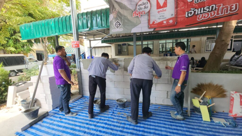เทคนิคระยอง จับมือปูนก่อสร้างลูกดิ่ง เติมทักษะงานก่อสร้างพื้นฐานตามมาตรฐานปูนลูกดิ่งแก่ นศ.วิชาช่างก่อสร้าง จับ นศ.ฉาบปูนจริงสร้างโรงอาหารที่อยู่ระหว่างก่อสร้างให้เป็นผลงานของ นศ.เลย